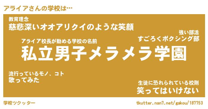 | 意味不明あだ名 | 『ペロリンアライア』『永久保存アライア』 |