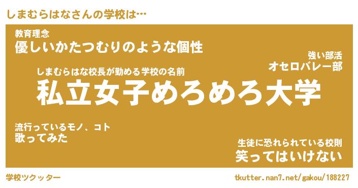 | ヒーロー風カッコイイあだ名 | 『スーパーシマムラハナ』『黄金騎士シマ』 |