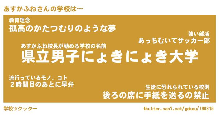 | 肩書あだ名 | 『あすかふね店長』『あすかふね総理大臣』 |