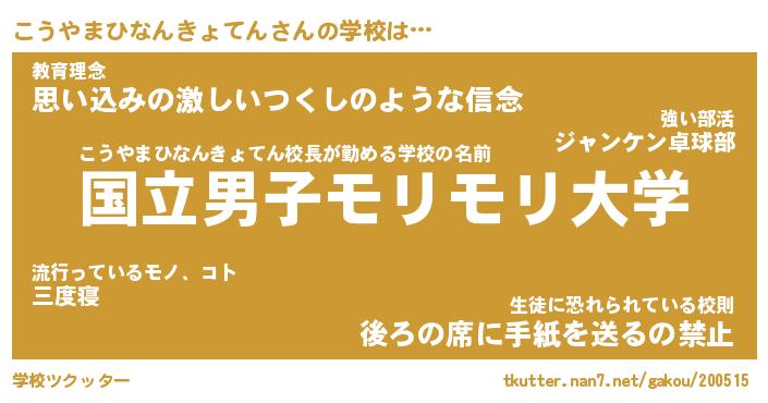 | 男性向けラノベタイトル風あだ名 | 『こうやまひなんきょてんの憂鬱』 |