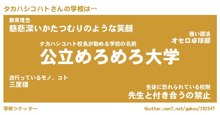 | 男性向けラノベタイトル風あだ名 | 『タカハシコハトの憂鬱』 |