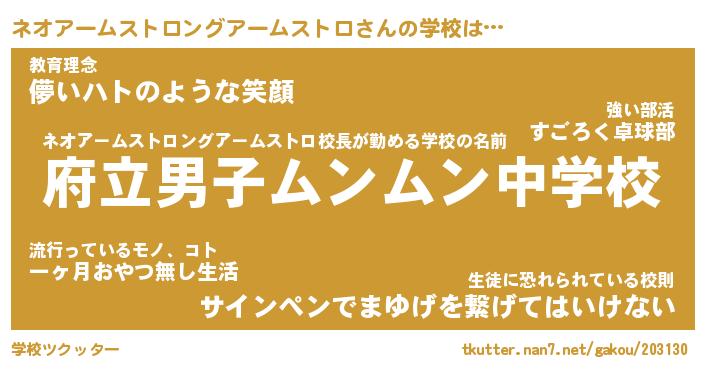| 先生 | ネオアームストロングアームストロ先生が勤める学校名『道立もふもふ中学校』 |