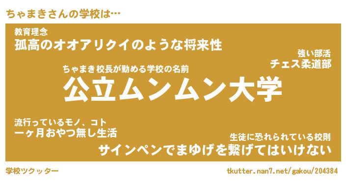 | 男性向けラノベタイトル風あだ名 | 『ちゃまきの憂鬱』 |