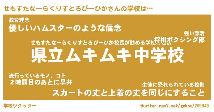 | 先生 | せもすたなーらくりすとろびーひか先生が勤める学校名『国立猫耳中学校』 |