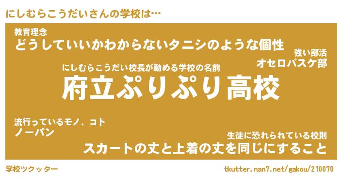 | 男性向けラノベタイトル風あだ名 | 『にしむらこうだいの憂鬱』 |