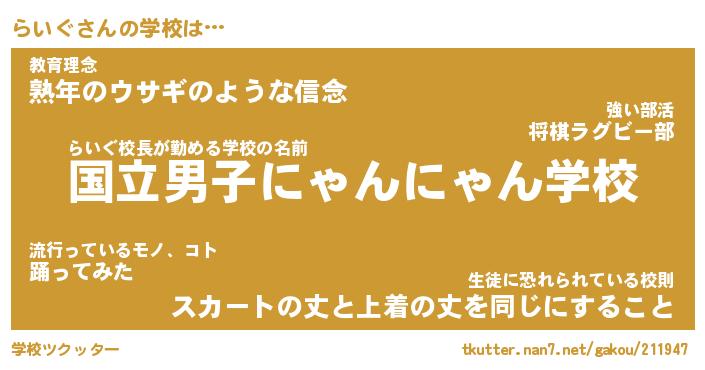 | 男性向けラノベタイトル風あだ名 | 『らいぐの憂鬱』 |