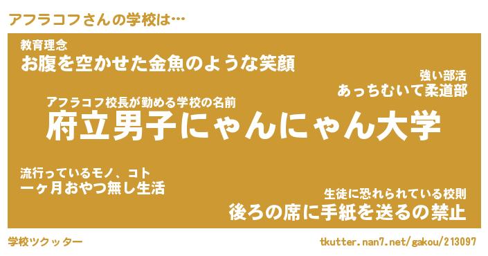 | 男性向けラノベタイトル風あだ名 | 『アフラコフアートオンライン』 |