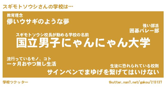 | ヘコむあだ名 | 『スギもー』『なまこ酢』『スギお』 |