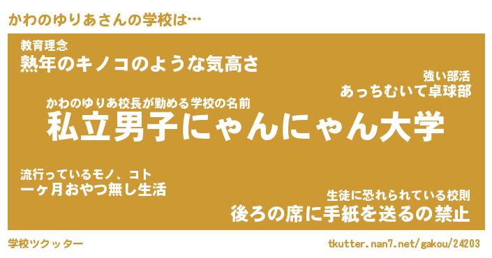 | 男性向けラノベタイトル風あだ名 | 『かわのゆりあの憂鬱』 |