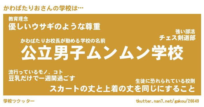 | 男性向けラノベタイトル風あだ名 | 『かわばたりおの憂鬱』 |