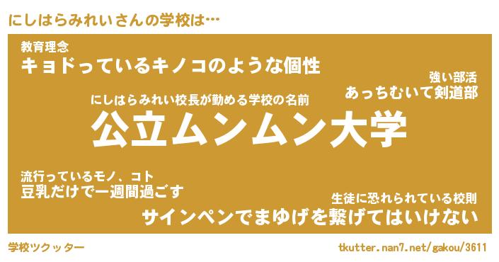| 恥ずかしいあだ名 | 『プリティーにしはらみれい』『にしちん』 |