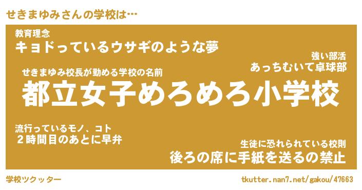 | 伝説のあだ名 | 『封印されしスナイパーせきまゆみ』 |