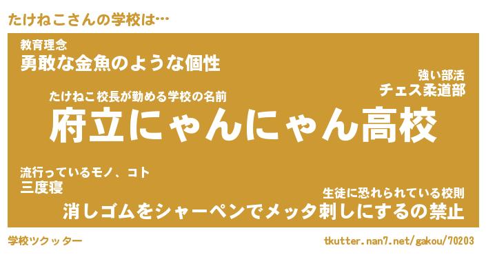 | 男性向けラノベタイトル風あだ名 | 『たけねこの憂鬱』 |