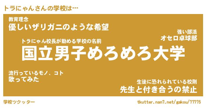 | 男性向けラノベタイトル風あだ名 | 『トラにゃんの憂鬱』 |