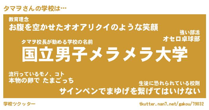 | 男性向けラノベタイトル風あだ名 | 『タマヲの憂鬱』 |