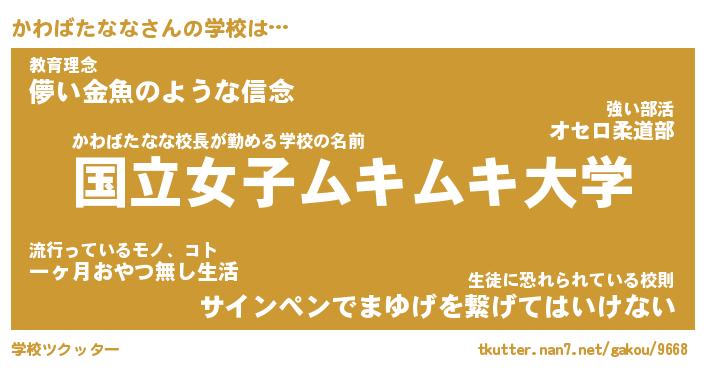 | 男性向けラノベタイトル風あだ名 | 『カワバタナナアートオンライン』 |