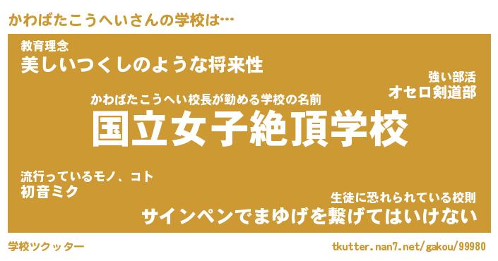 | 女子向けラノベタイトル風あだ名 | 『誰かこのかわばたこうへいを説明してください! ~契約から始まるウェディング~』 |
