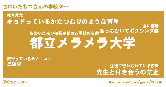 | 肩書あだ名 | 『さわいたもつ社長』『さわいたもつ教頭』 |