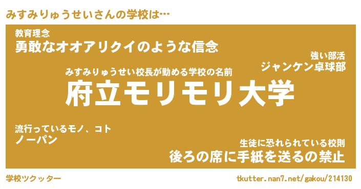 | 男性向けラノベタイトル風あだ名 | 『みすみりゅうせいの憂鬱』 |