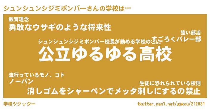 | 男性向けラノベタイトル風あだ名 | 『シュンシュンシジミボンバーの憂鬱』 |