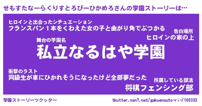 | 女子向けラノベタイトル風あだ名 | 『(仮)せもすたなーらくりすとろびーひかめろのやんごとなき事情』 |