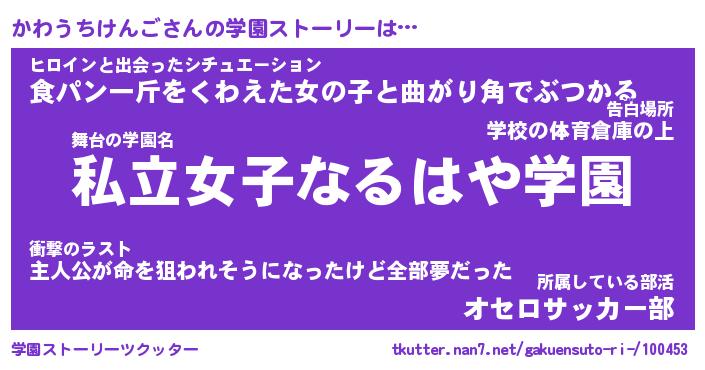 | 女子向けラノベタイトル風あだ名 | 『誰かこのかわうちけんごを説明してください! ~契約から始まるウェディング~』 |
