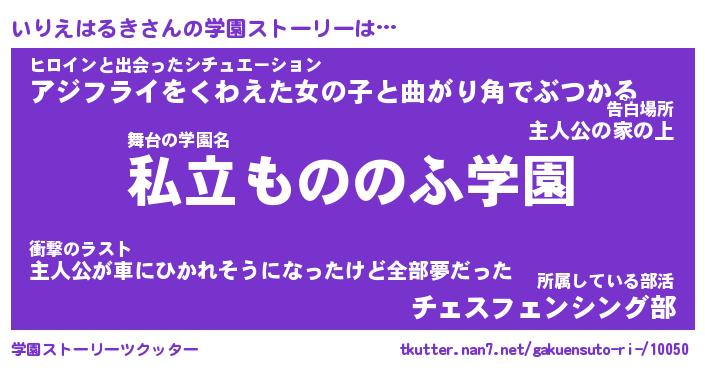 | 女子向けラノベタイトル風あだ名 | 『(仮)いりえはるきのやんごとなき事情』 |