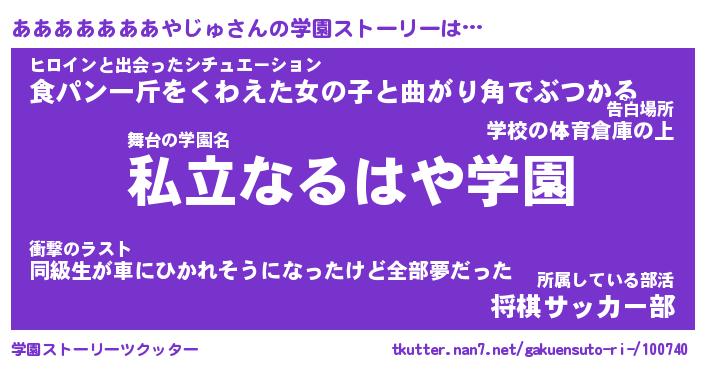 | 伝説のあだ名 | 『伝説のスナイパーあああああああやじゅ』 |