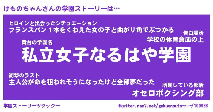 | ヘコむあだ名 | 『けももー』『なまこ酢』『けもっ子』 |