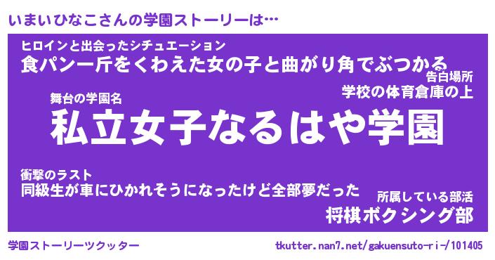 | 男性向けラノベタイトル風あだ名 | 『イマイヒナコアートオンライン』 |
