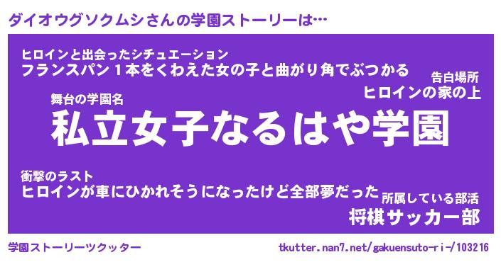 | 女子向けラノベタイトル風あだ名 | 『ダイオウグソクムシ姫と円卓の騎士』 |