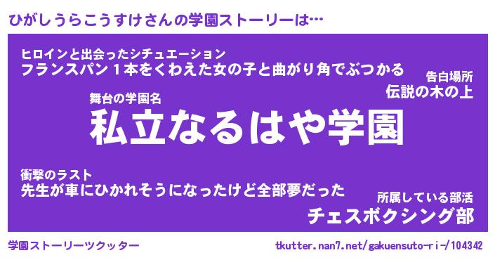 | 男性向けラノベタイトル風あだ名 | 『ひがしうらこうすけの憂鬱』 |