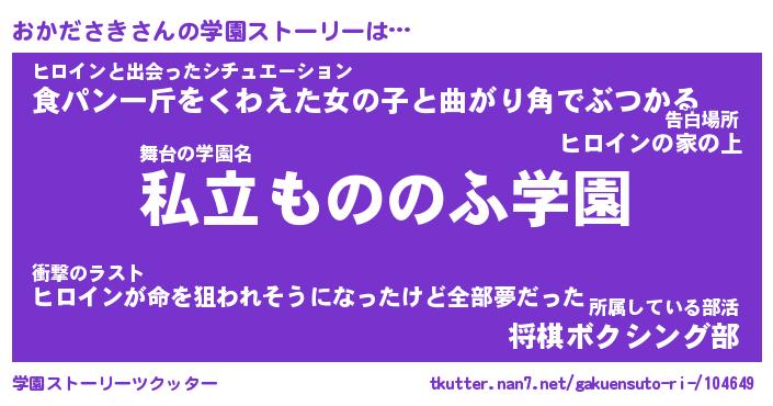 | 男性向けラノベタイトル風あだ名 | 『おかださきの憂鬱』 |