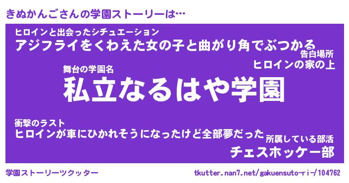 | 男性向けラノベタイトル風あだ名 | 『きぬかんごの憂鬱』 |