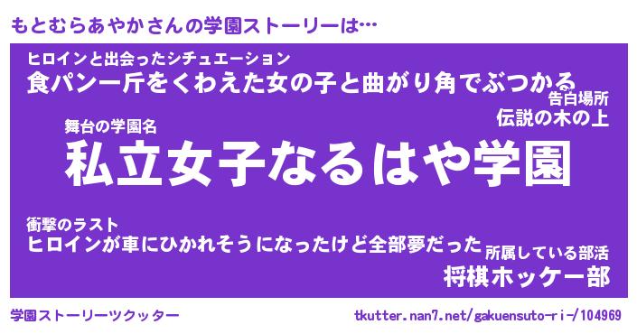 | 女子向けラノベタイトル風あだ名 | 『誰かこのもとむらあやかを説明してください! ~契約から始まるウェディング~』 |