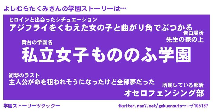 | 女子向けラノベタイトル風あだ名 | 『誰かこのよしむらたくみを説明してください! ~契約から始まるウェディング~』 |