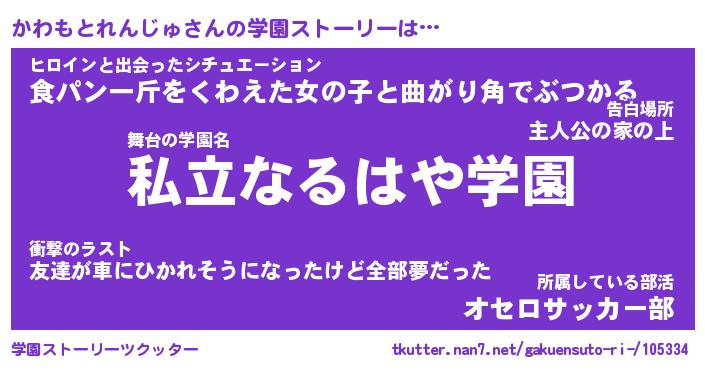 | 男性向けラノベタイトル風あだ名 | 『かわもとれんじゅの憂鬱』 |
