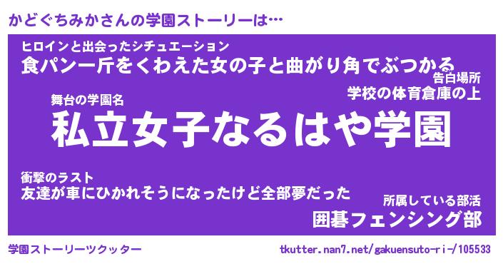 | 男性向けラノベタイトル風あだ名 | 『カドグチミカアートオンライン』 |