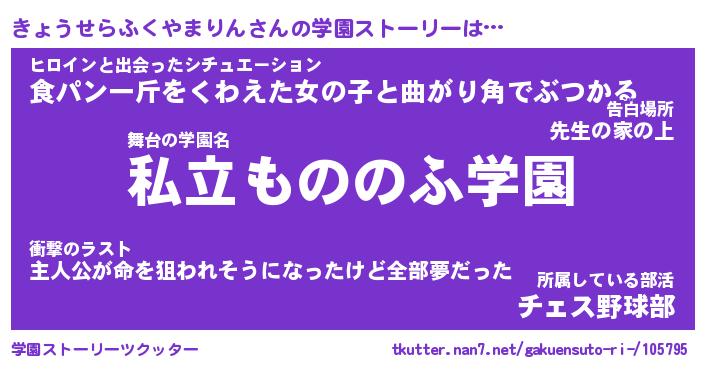 | 女子向けラノベタイトル風あだ名 | 『(仮)きょうせらふくやまりんのやんごとなき事情』 |