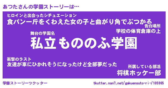 | 男性向けラノベタイトル風あだ名 | 『あつたの憂鬱』 |