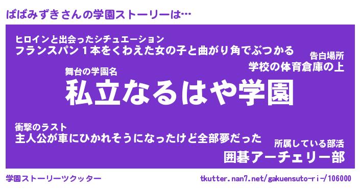 | 女子向けラノベタイトル風あだ名 | 『(仮)ばばみずきのやんごとなき事情』 |