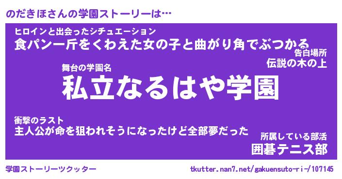 | 伝説のあだ名 | 『伝説のスナイパーのだきほ』 |