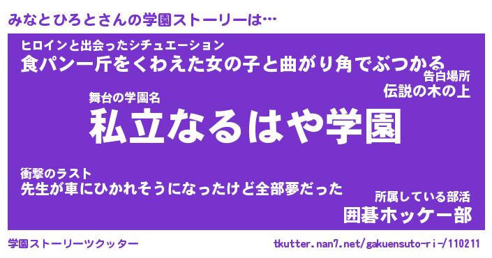 | 告白場所 先生の家の上 …「ふぃぎゅこ」 | 2月17日 06:24 |