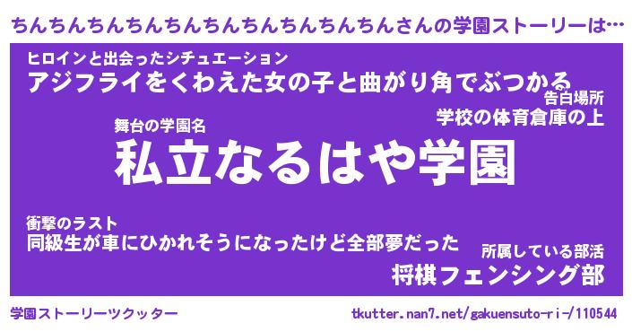 | 女子向けラノベタイトル風あだ名 | 『(仮)ちんちんちんちんちんちんちんちんちんちんのやんごとなき事情』 |
