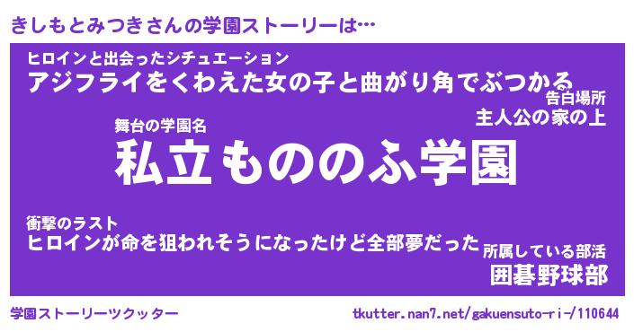| 男性向けラノベタイトル風あだ名 | 『きしもとみつきの憂鬱』 |
