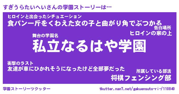 | 女子向けラノベタイトル風あだ名 | 『(仮)すぎうらたいへいのやんごとなき事情』 |
