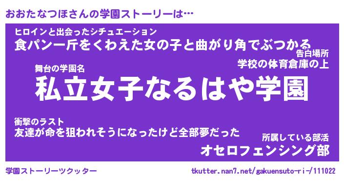 | 女子向けラノベタイトル風あだ名 | 『おおたなつほ姫と円卓の騎士』 |