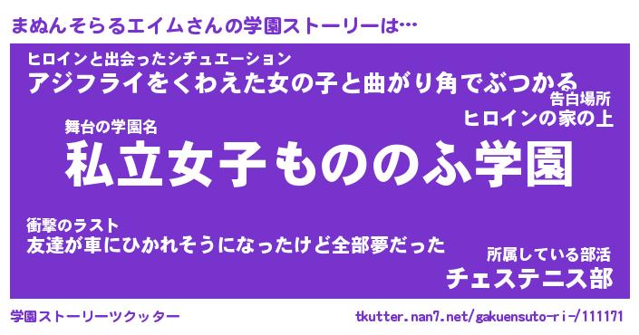 | 学校 | まぬんそらるエイム校長が勤める学校の名前『都立女子ムキムキ学園』 |