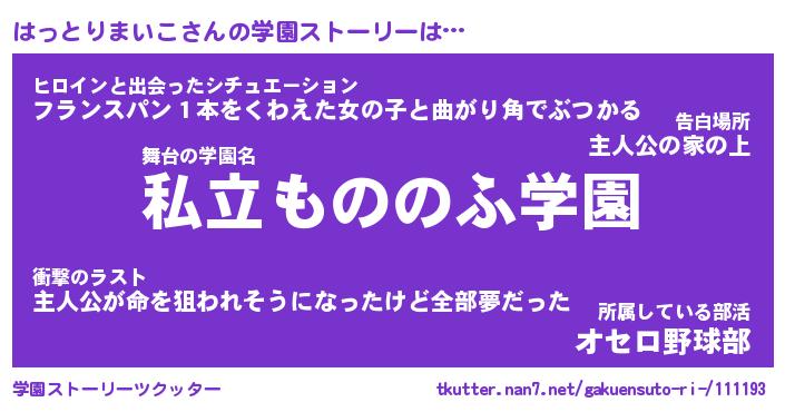 | 女子向けラノベタイトル風あだ名 | 『(仮)はっとりまいこのやんごとなき事情』 |