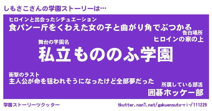 | 男性向けラノベタイトル風あだ名 | 『しもさこの憂鬱』 |